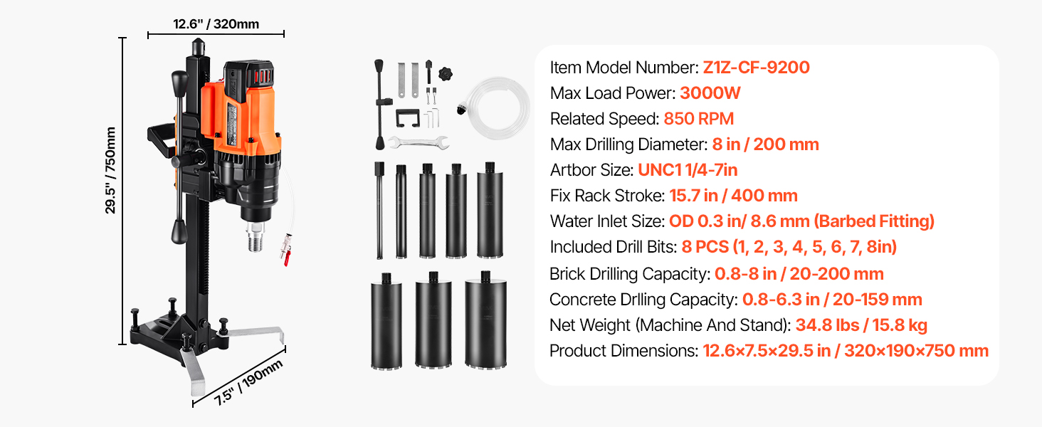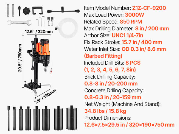 - Powerful & Fast Drilling: This core drill is equipped with a robust 3000W motor and spins at 800 RPM, delivering fast, efficient drilling. It handles holes up to 8 in (200 mm) with a 1/4-7 in threaded output shaft—ideal for heavy-duty tasks