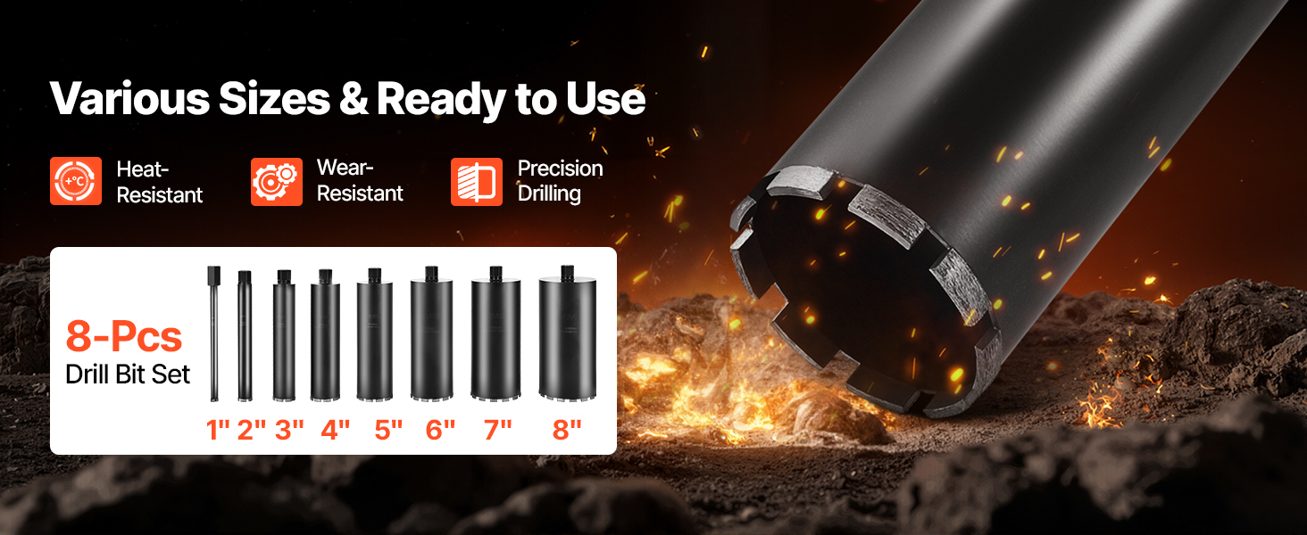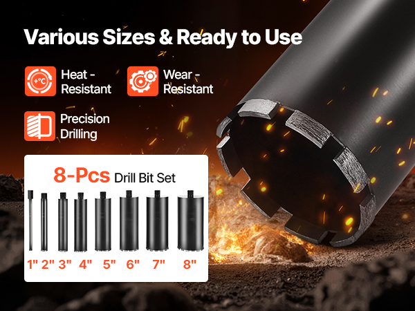 - Professional Kit: Comes fully loaded. This concrete core drill includes eight premium drill bits (1 in, 2 in, 3 in, 4 in, 5 in, 6 in, 7 in, 8 in) that cut through reinforced concrete, brick, marble, and more. It is ideal for all your drilling needs.