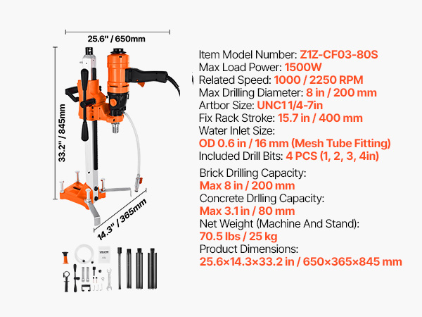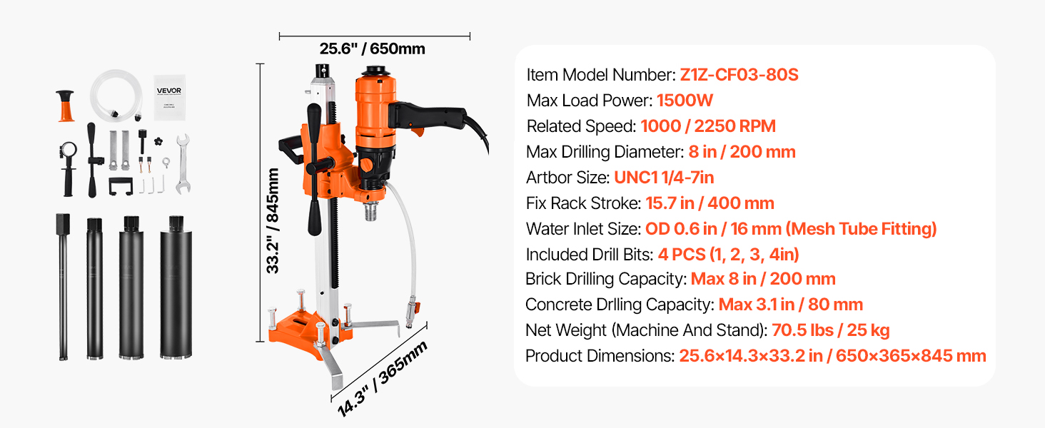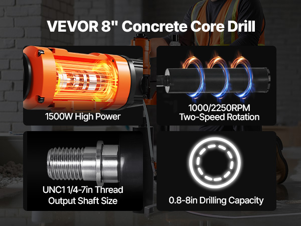 - Powerful & Fast Drilling: This core drill features a robust 1800W motor and dual-speed settings (1075 RPM/2300 RPM), delivering fast, efficient drilling. It handles holes up to 8 in (200 mm) with a 1/4-7 in threaded output shaft—ideal for tough tasks.
