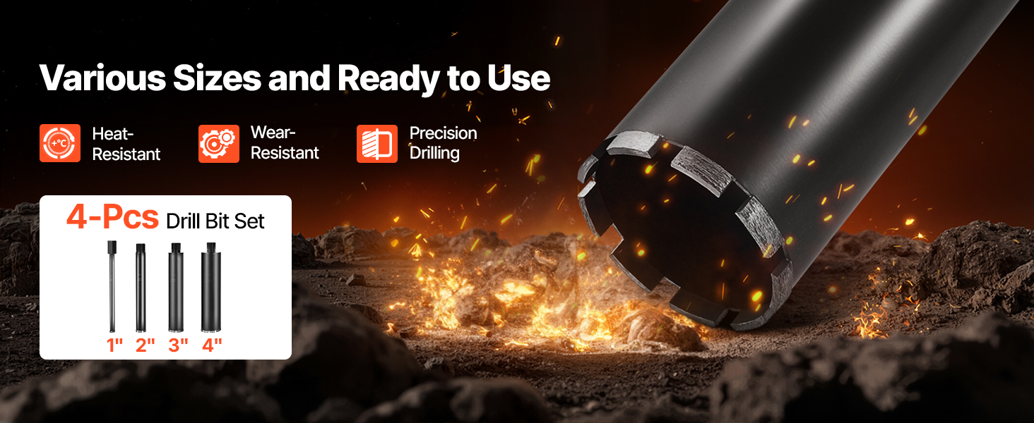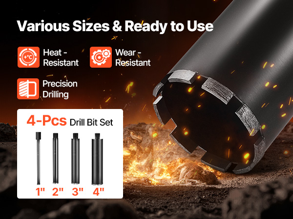 - Professional Kit: Comes fully loaded. This concrete core drill includes four premium drill bits (1 in, 2 in, 3 in, 4 in) that cut through reinforced concrete, brick, marble, and more. It is ideal for all your drilling needs.