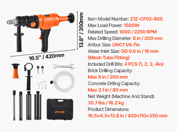 - Powerful & Fast Drilling: This core drill features a robust 1800W motor and dual-speed settings (1075 RPM/2300 RPM), delivering fast, efficient drilling. It handles holes up to 8 in (200 mm) with a 1/4-7 in threaded output shaft—ideal for tough tasks.