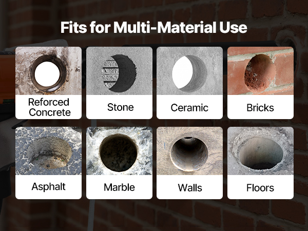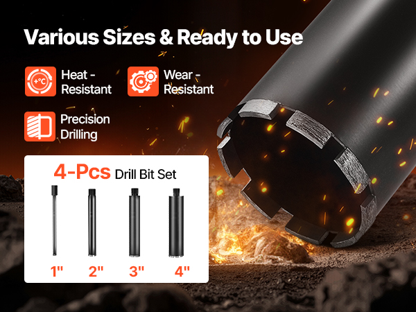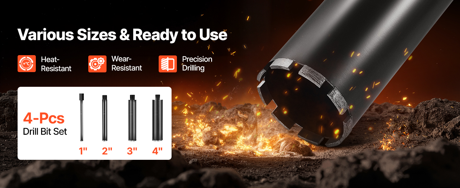 - Professional Kit: Comes fully loaded. This concrete core drill includes four premium drill bits (1 in, 2 in, 3 in, 4 in) that cut through reinforced concrete, brick, marble, and more. It is ideal for all your drilling needs.