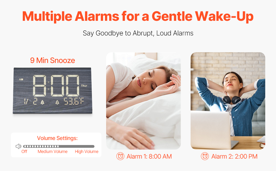 Equipped with two independent alarm settings and a 9-minute snooze function, this digital alarm clock lets you enjoy a brief rest before starting your day. Whether you prefer a soft or louder wake-up sound, the three adjustable volume levels ensure the ideal alarm to fit your needs.