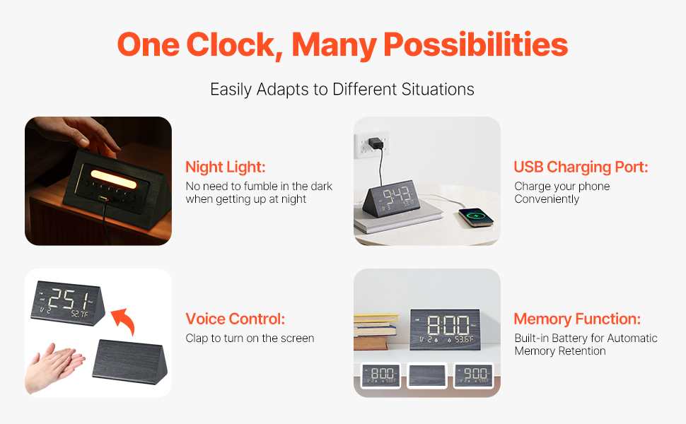 Whether you need a nightlight to guide your way, an extra charging port for your phone, or simply a clear screen to check the time, this bedside alarm clock has you covered. Plus, it remembers your settings even after a power outage, so your schedule stays intact without any interruptions.