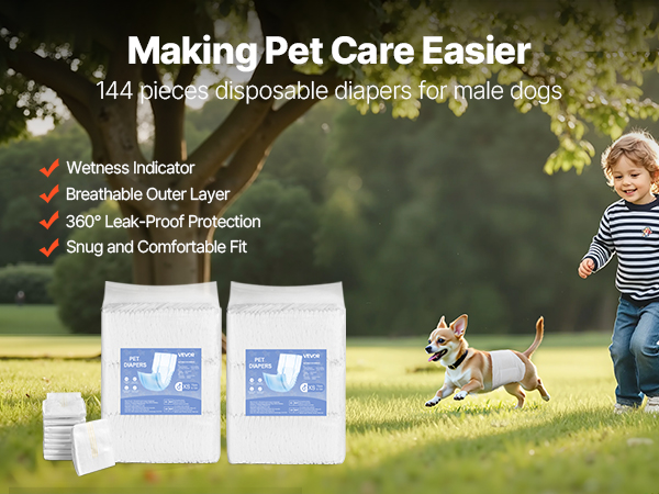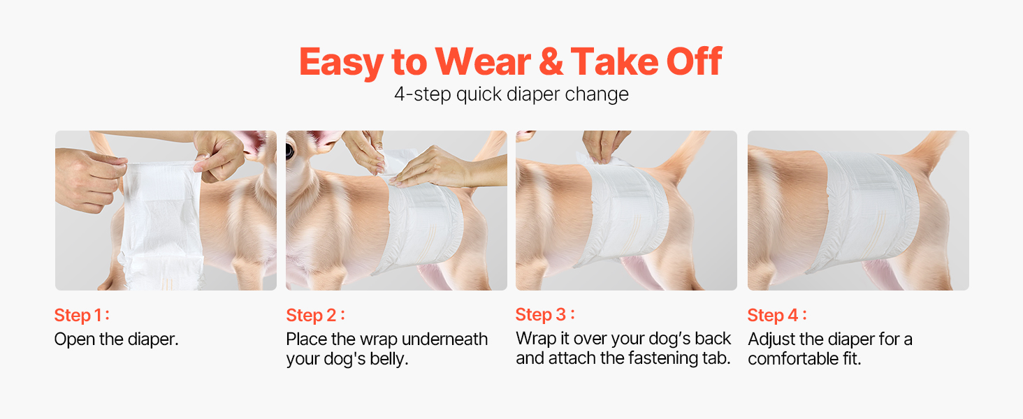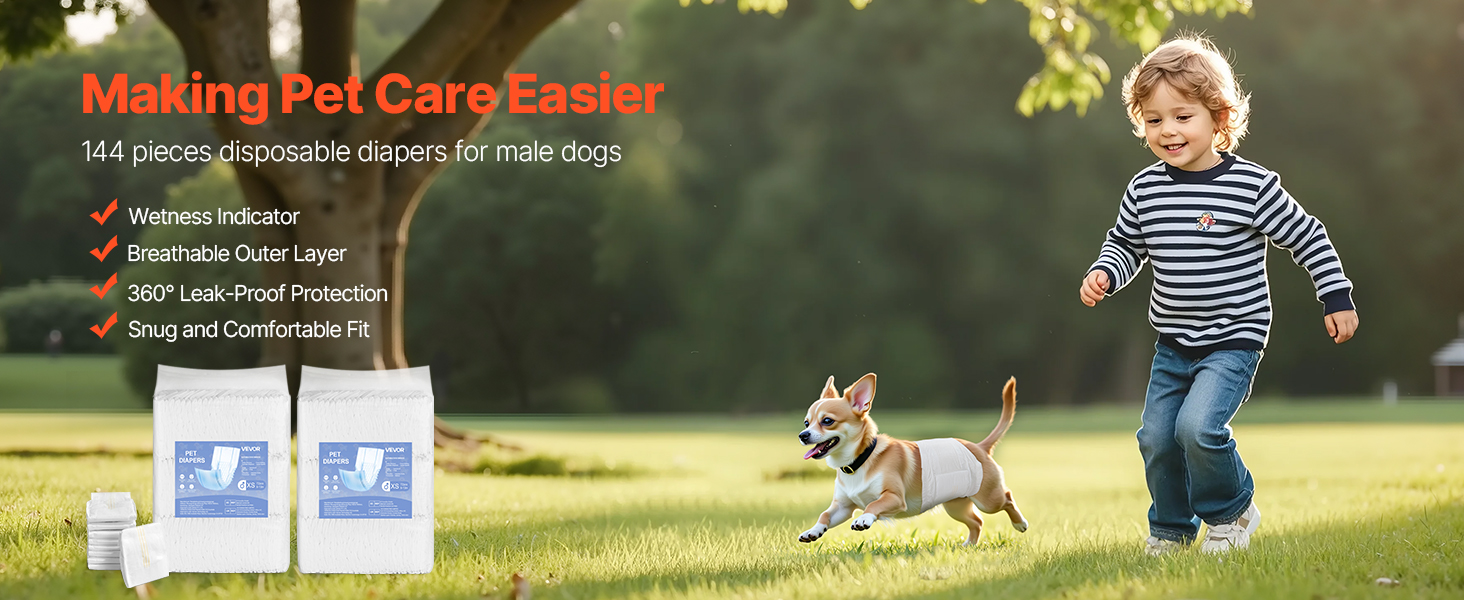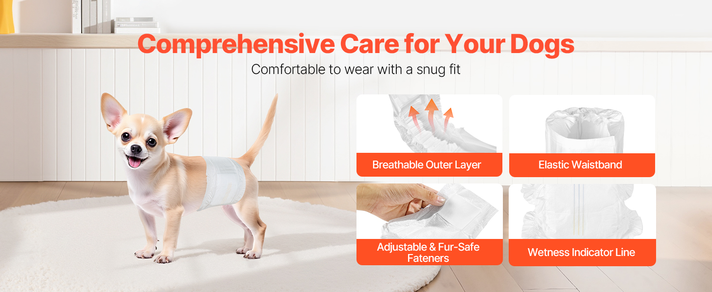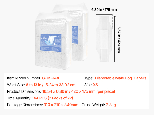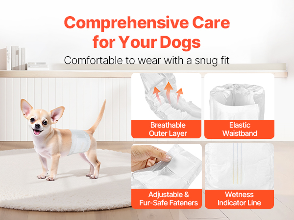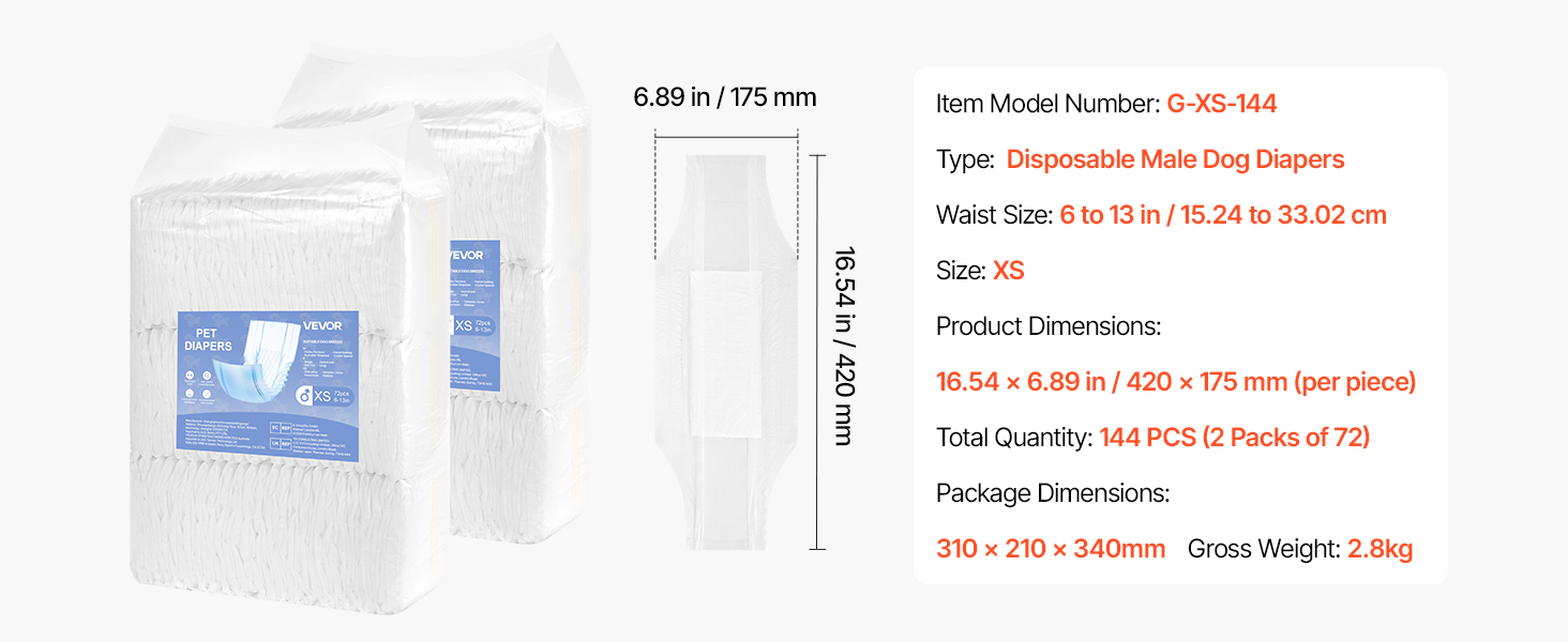 - Super Absorbent: VEVOR XS-sized disposable male dog diapers feature a super absorbent core that quickly locks in liquid, offering 360° leak-proof protection with no backflow. Perfect for dogs in heat cycles, pet training, incontinence, post-surgery recovery, and travel. Suitable Waist Size: 6-13 inches / 15.24 – 33.02 cm