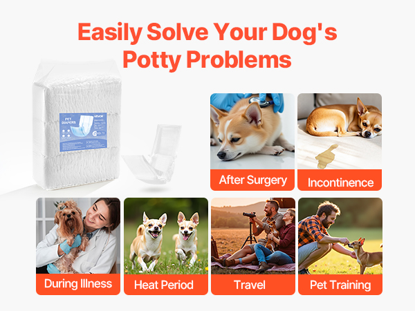 Perfect for various situations such as illness recovery, post-surgery care, senior incontinence, heat cycles, travel, and potty training. These super absorbent male dog diapers make daily pet care easier, easily solving your dog’s potty problems and giving you peace of mind.