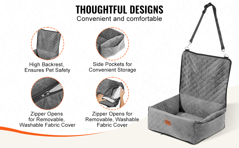 - Convenient & Practical Design: The pet car seat features a large side storage pocket for pet essentials, an extended backrest for added safety during braking. The removable pad includes a waterproof layer on the bottom, preventing pet waste from seeping through and making cleaning easy.