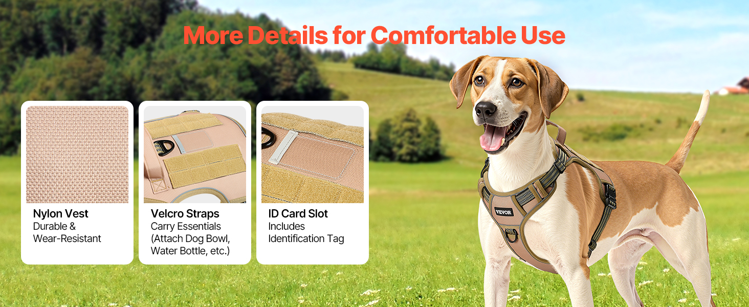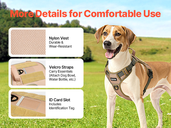 - Self-adhesive Straps: Equipped with self-adhesive straps on both sides, this no-pull vest is ideal for law enforcement, hunting, or outdoor activities. It can carry gear such as water bottles or bowls, and the center slot is ideal for storing ID tags for quick identification.