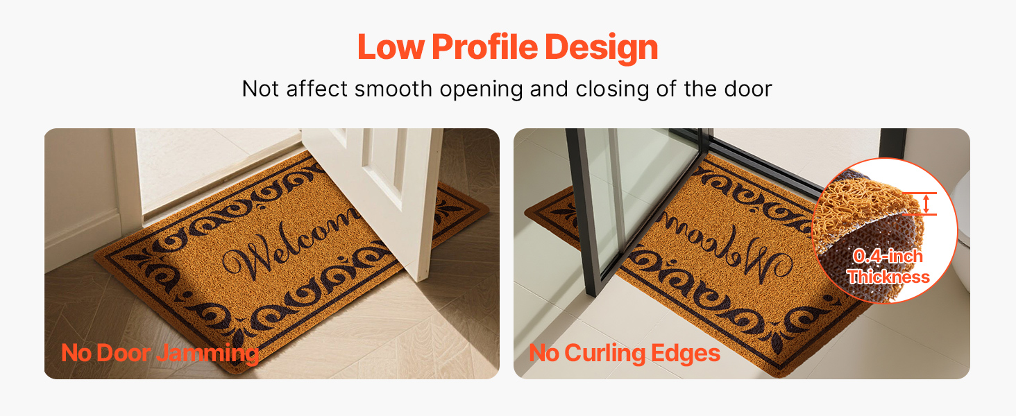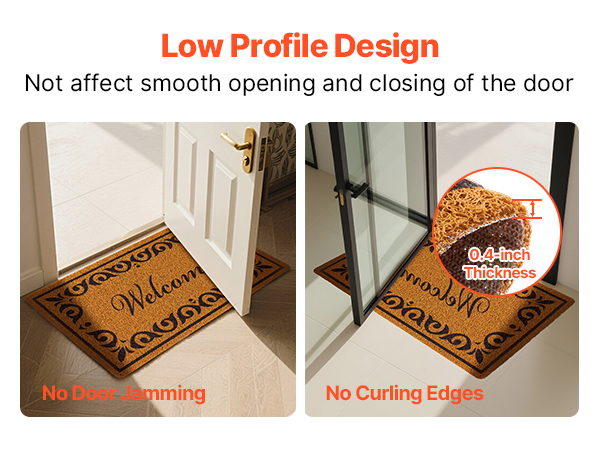 - Low Profile Design: Our front door mat features a 0.4-inch thick, low-profile design that allows doors to open and close smoothly without getting stuck. Its neatly cut edges lie flat against the floor, preventing curling and reducing the risk of tripping.