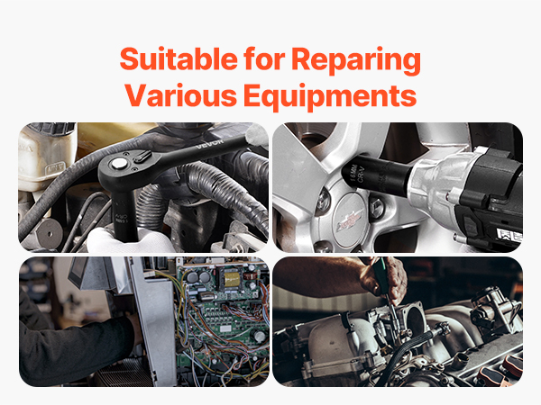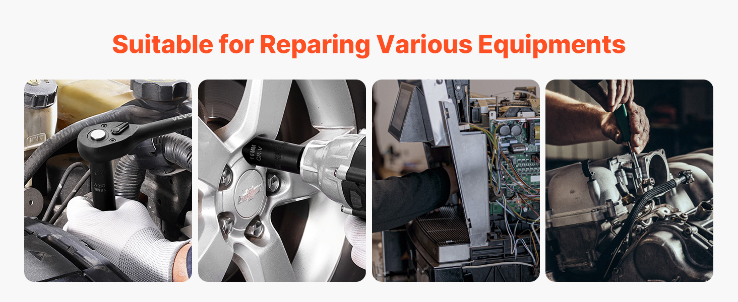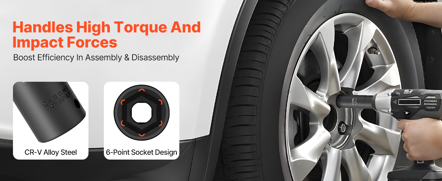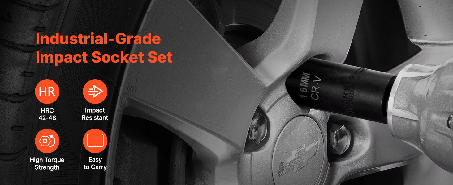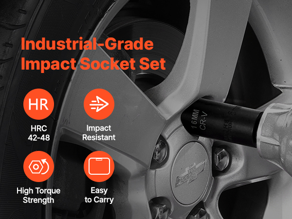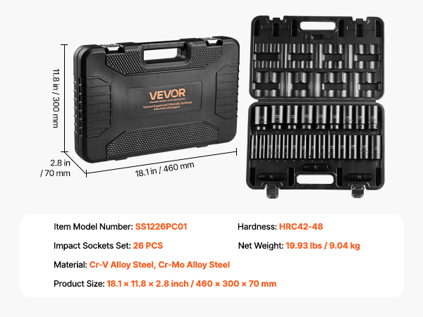 VEVOR 1/2-inch 26-piece drive deep impact socket set is made from CR-V and Cr-Mo alloy steel, with an HRC 42-48 hardness, ideal for heavy-duty tasks like auto repairs. This set includes 26 deep metric sockets, hexagonal drive designs, laser-etched size markings, and a sturdy toolbox.