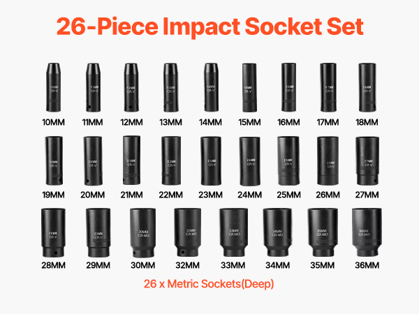 - 26-Piece Impact Socket Set: Includes 26 deep metric sockets: 10mm, 11mm, 12mm, 13mm, 14mm, 15mm, 16mm, 17mm, 18mm, 19mm, 20mm, 21mm, 22mm, 23mm, 24mm, 25mm, 26mm, 27mm, 28mm, 29mm, 30mm, 32mm, 33mm, 34mm, 35mm, 36mm
