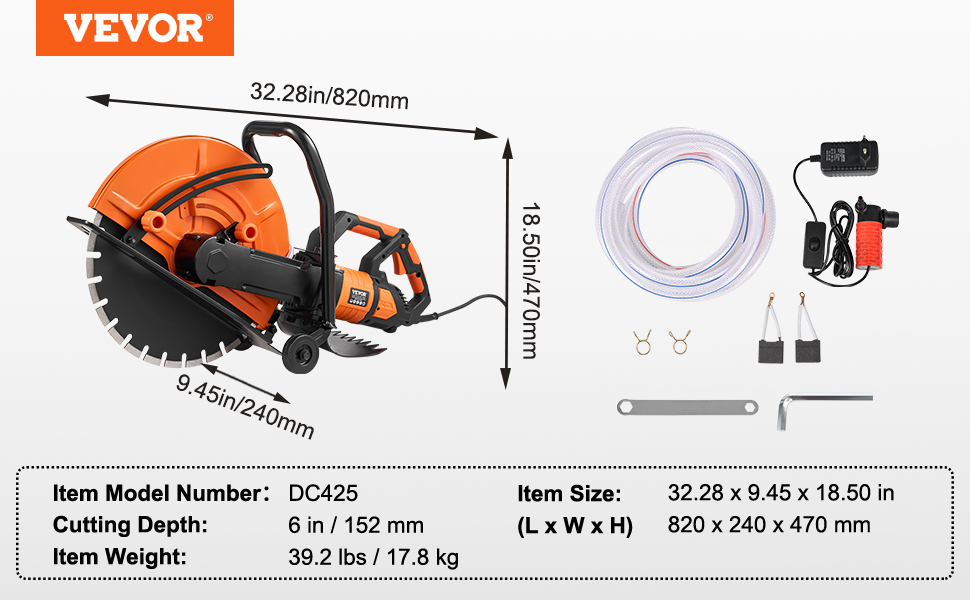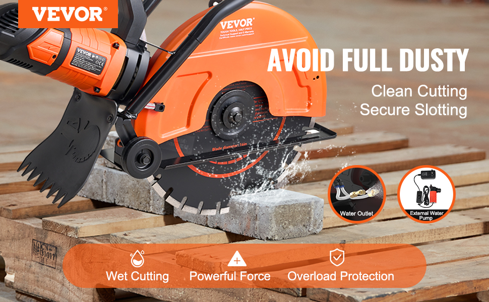- A Clean Wet Cut: The VEVOR electric concrete saw offers a better cutting experience and reduces body damage by preventing debris from spreading during cutting operations. It also includes a wet-cutting attachment, which provides direct water spraying and eliminates the need for one-handed watering while cutting. This improves operational security and makes cutting easier.