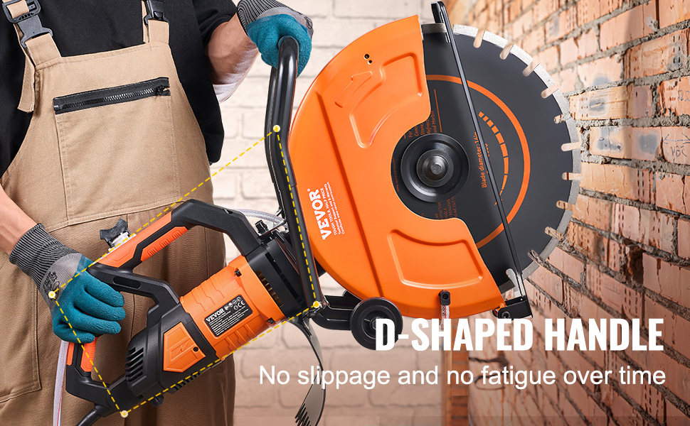 The concrete cutting saw has a scientifically optimized weight distribution thanks to its handle. The handle also features a non-slip surface, preventing it from easily slipping and causing fatigue during extended use.
