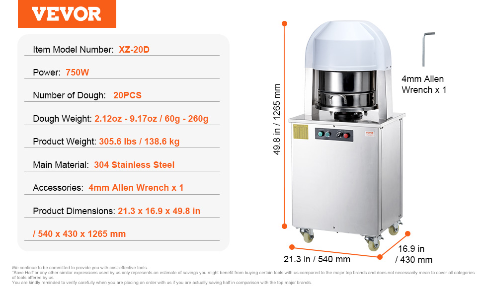 The machine can divide large dough into 20 evenly sized portions at one time, with each portion weighing between 60 and 260 grams (2.12 to 9.17 oz).