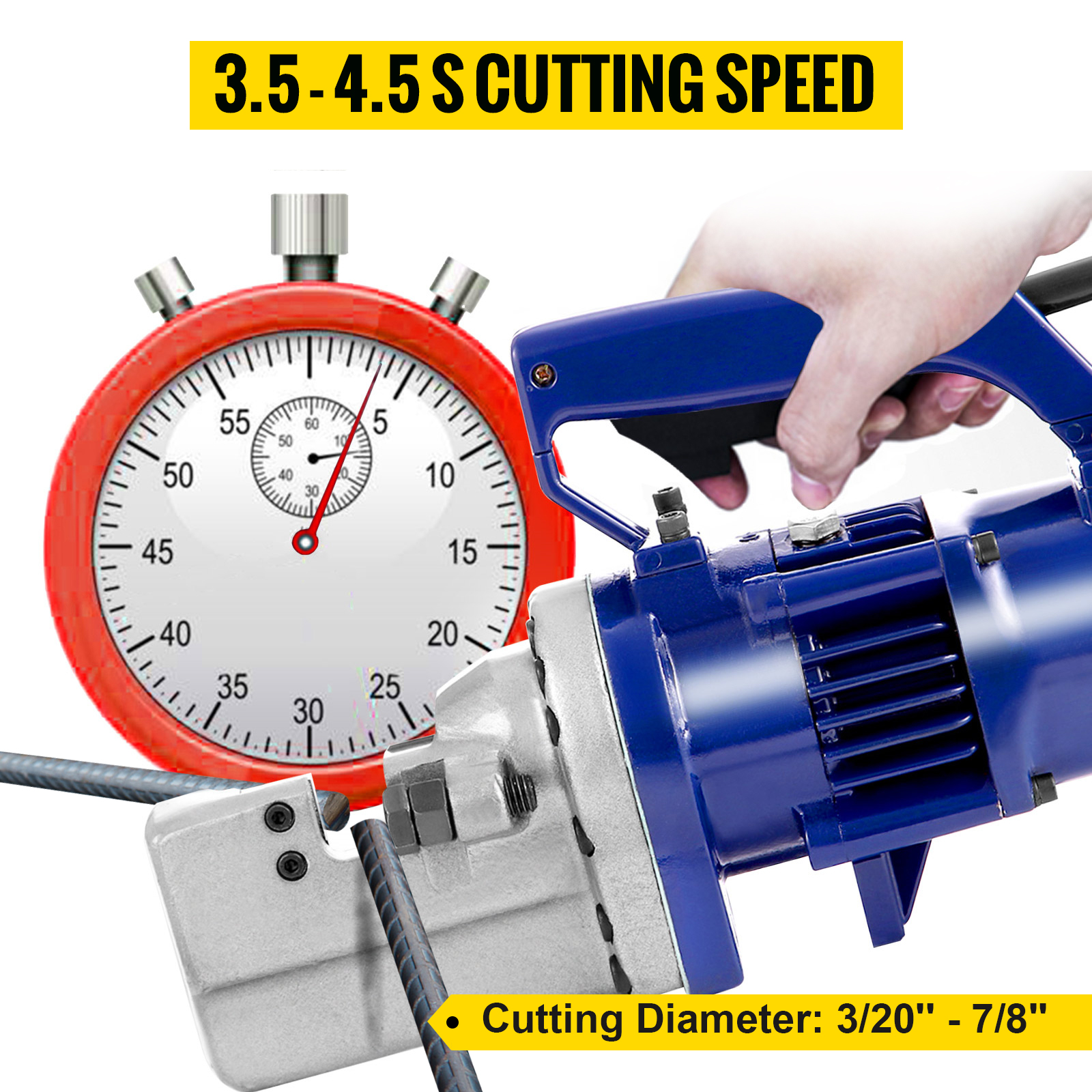 - Super-Fast Cutting Speed: The electric hydraulic rebar cutter cuts rebar within 3.5–4.5 seconds without sparks and sentiments. Cutting capacity ranges from 3/20" (4 mm) #3 to 7/8" (22 mm) #7 Grade 60. It satisfies your various cutting demands. Cut rebar types: medium carbon rebar, low carbon rebar, round rebar, screw thread steel, etc.