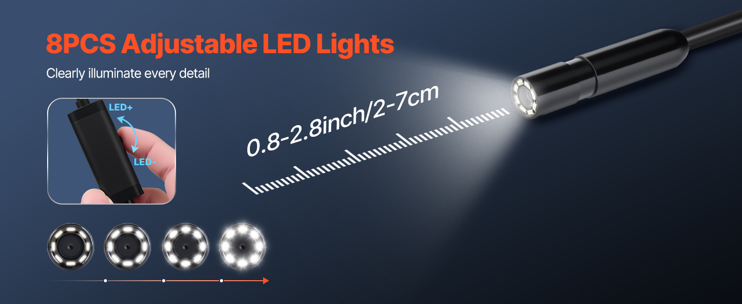 The industrial inspection camera has 8 LED lights with adjustable brightness to provide enough light for dark situations. 0.8-2.8 inch (2-7cm) optimal focal distance offers a large field of view for clear inspection, great for internal engine cylinder and plumbing inspection.