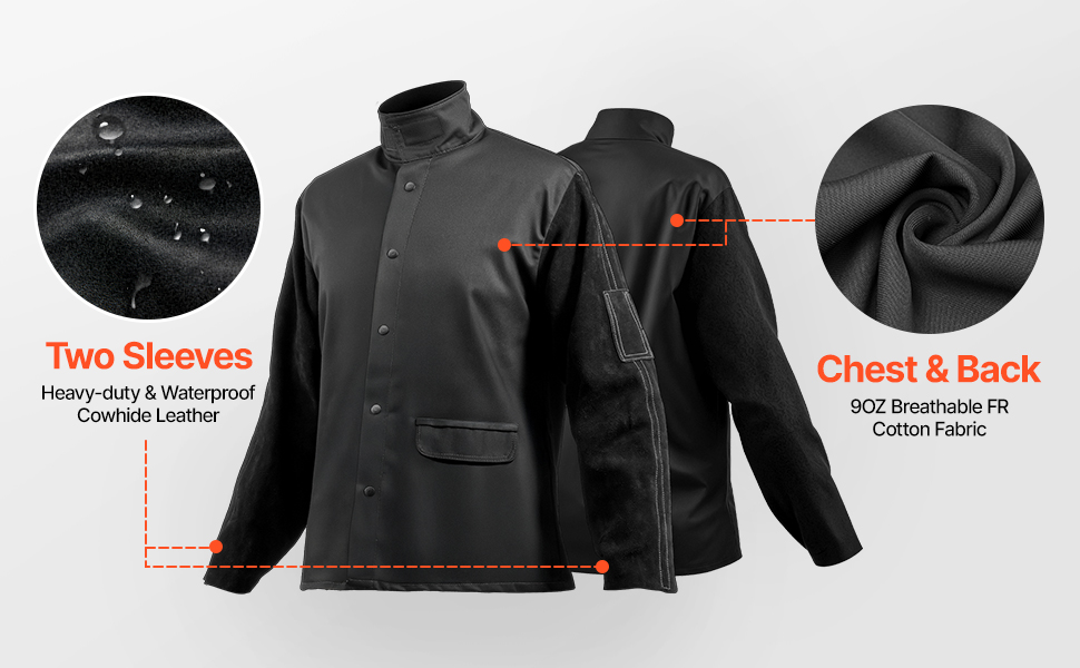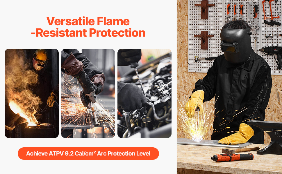 - Outstanding Flame Resistance: Our welding jacket is made from heavy-duty split cowhide leather and 9 oz. flame-resistant pure cotton. The cowhide sleeves protect you from sparks and flames, and the flame-resistant cotton on the chest and back ensures comfort and breathability. It meets the ATPV 9.2 Cal/cm² arc rating for safer welding work.