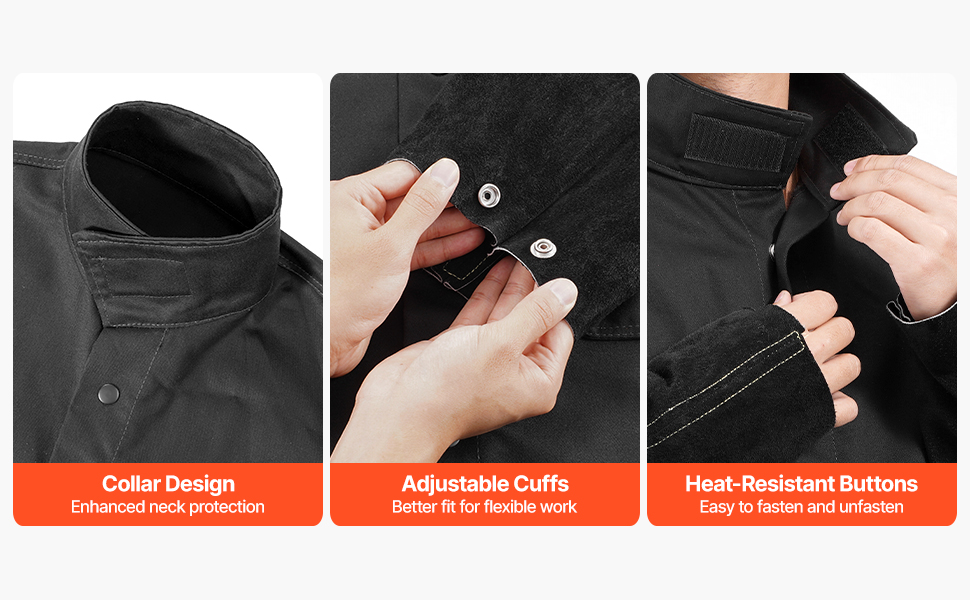 The thoughtfully designed collar provides enhanced neck protection for added safety. Adjustable cuffs offer a better fit, allowing for greater flexibility during work. With sturdy snap buttons, the welding safety jacket is easy to put on and take off.