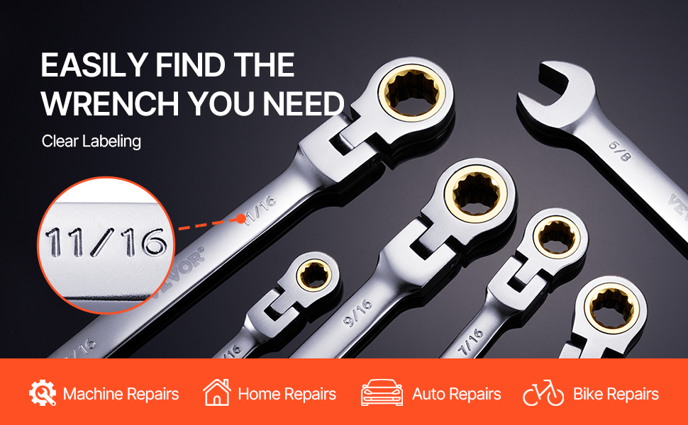 Each wrench in the flex head wrench set features clear size markings, allowing you to quickly find the right tool, saving time and hassle during repairs.