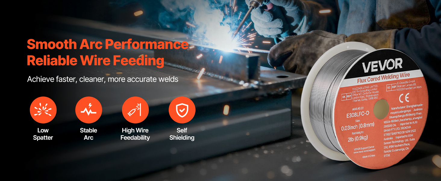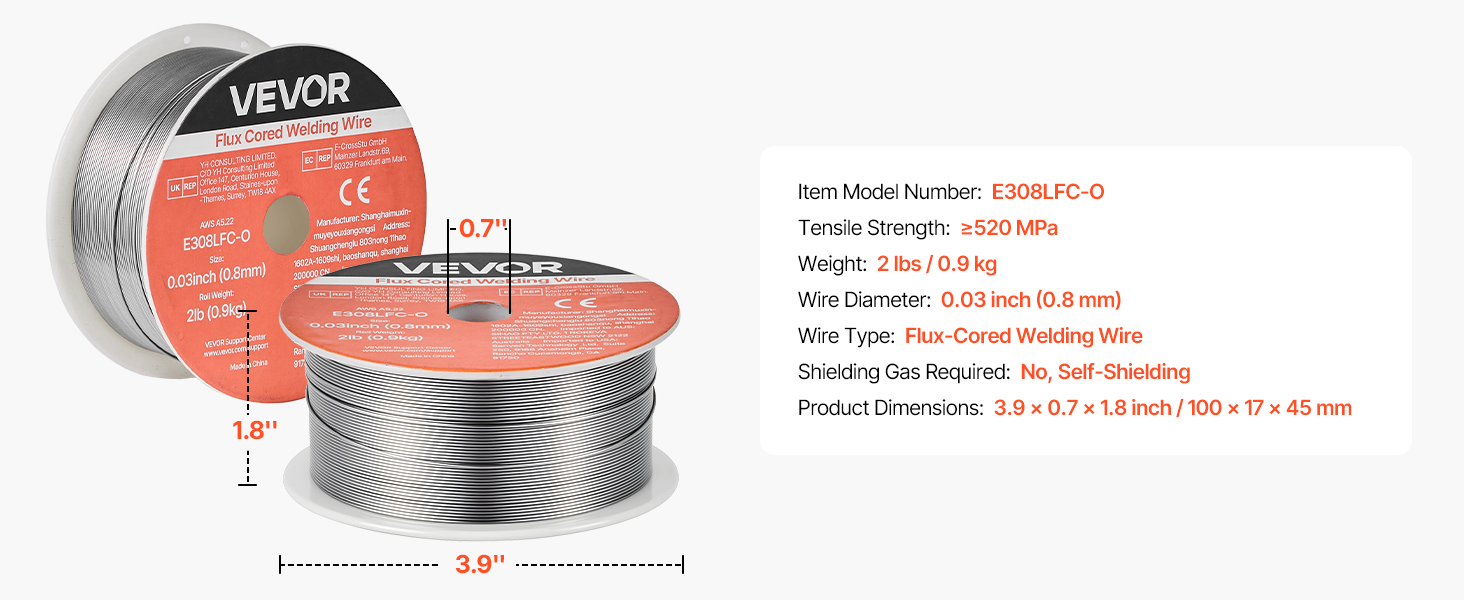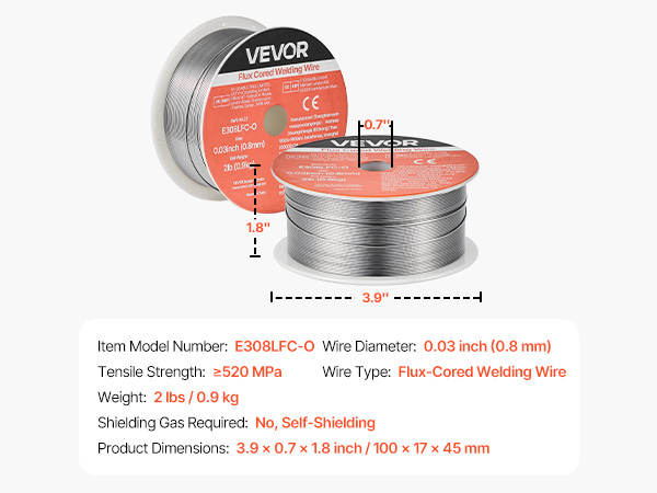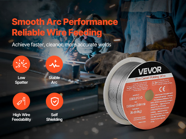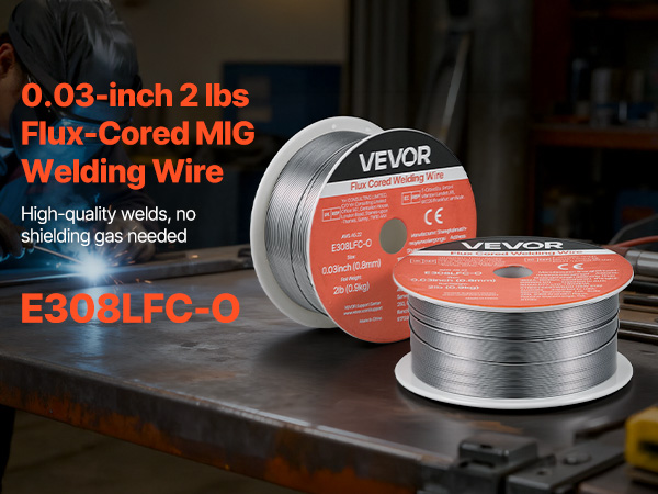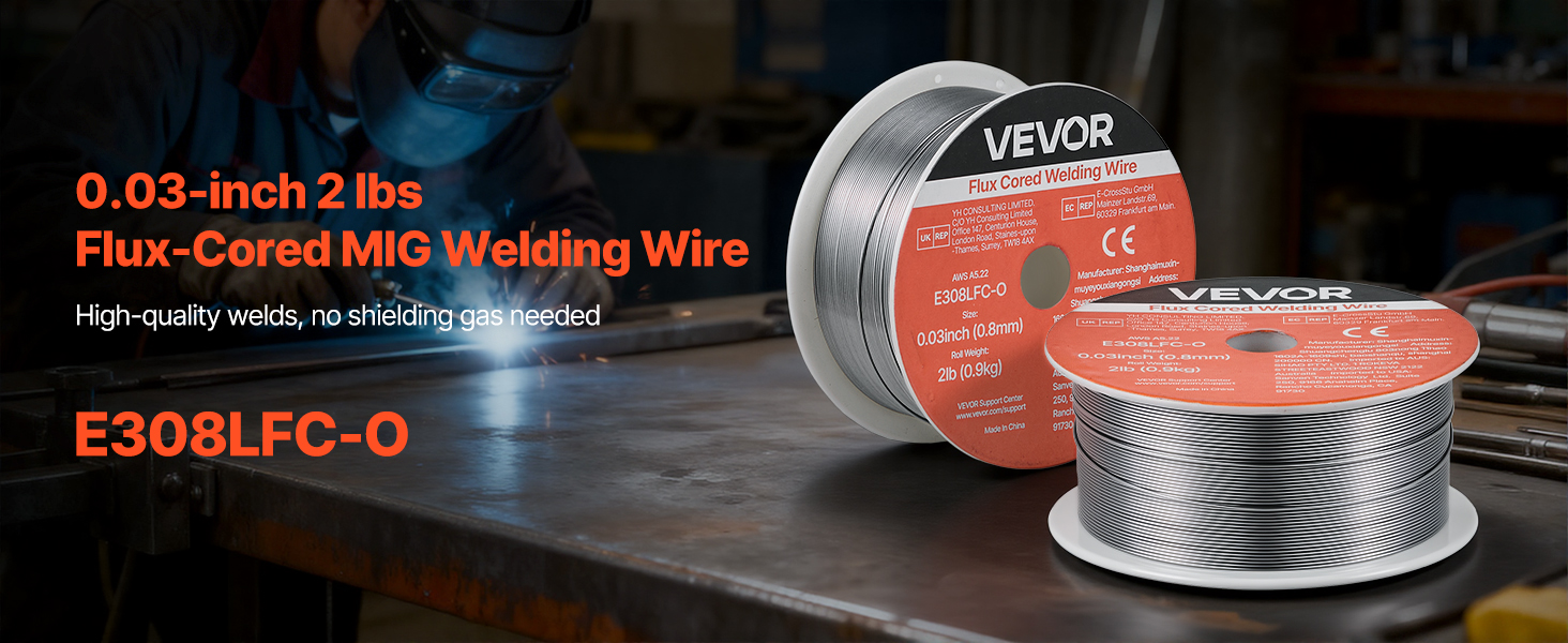 VEVOR 0.03″ 2 lbs E308LFC-O flux core welding wire delivers strong, consistent welds with smooth wire feeding and low spatter. Supports all-position gasless welding and high tensile strength for reliable performance in automotive, machinery, and DIY welding projects.