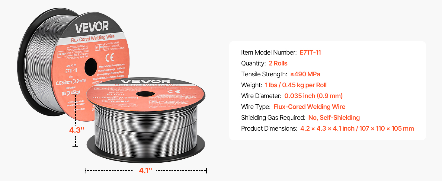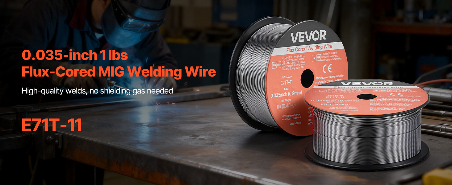 VEVOR 0.035″ 1 lbs E71T-11 flux core welding wire delivers strong, consistent welds with smooth wire feeding and low spatter. Supports all-position gasless welding, multi-pass welding and high tensile strength for reliable performance in automotive, machinery, and DIY welding projects.