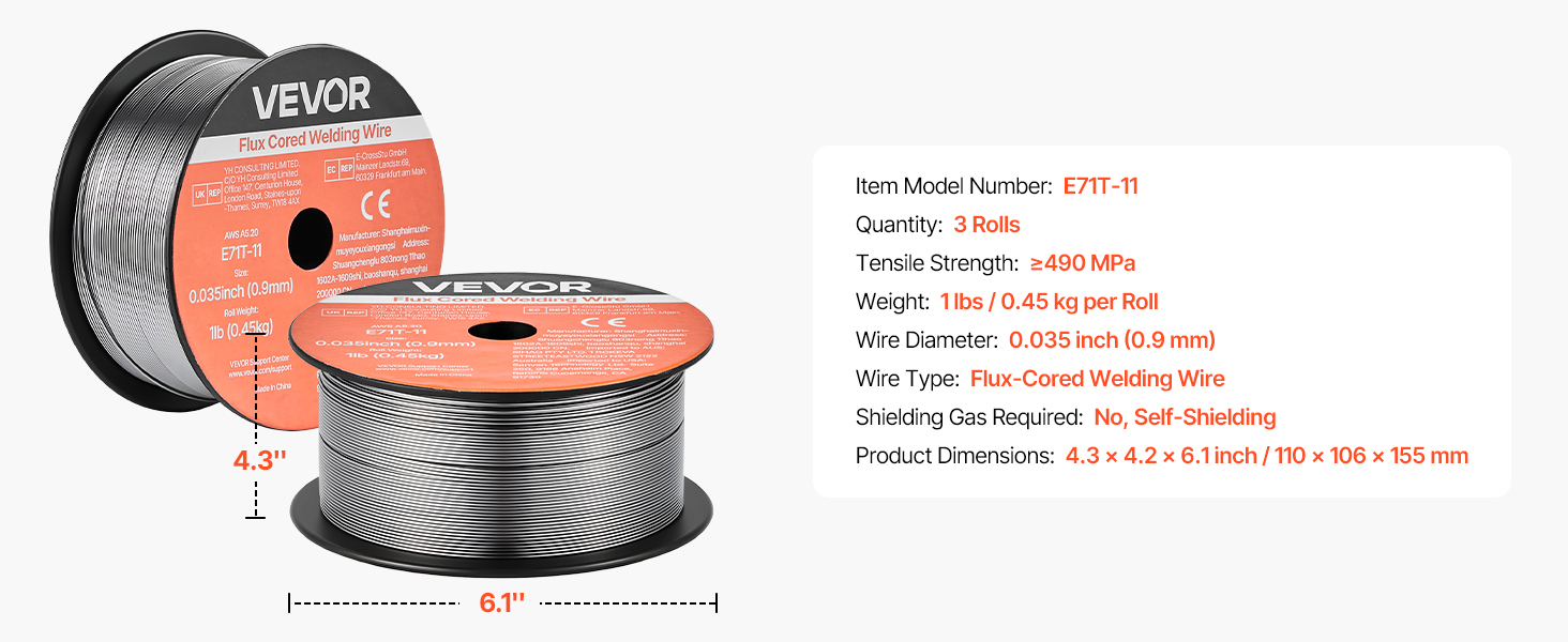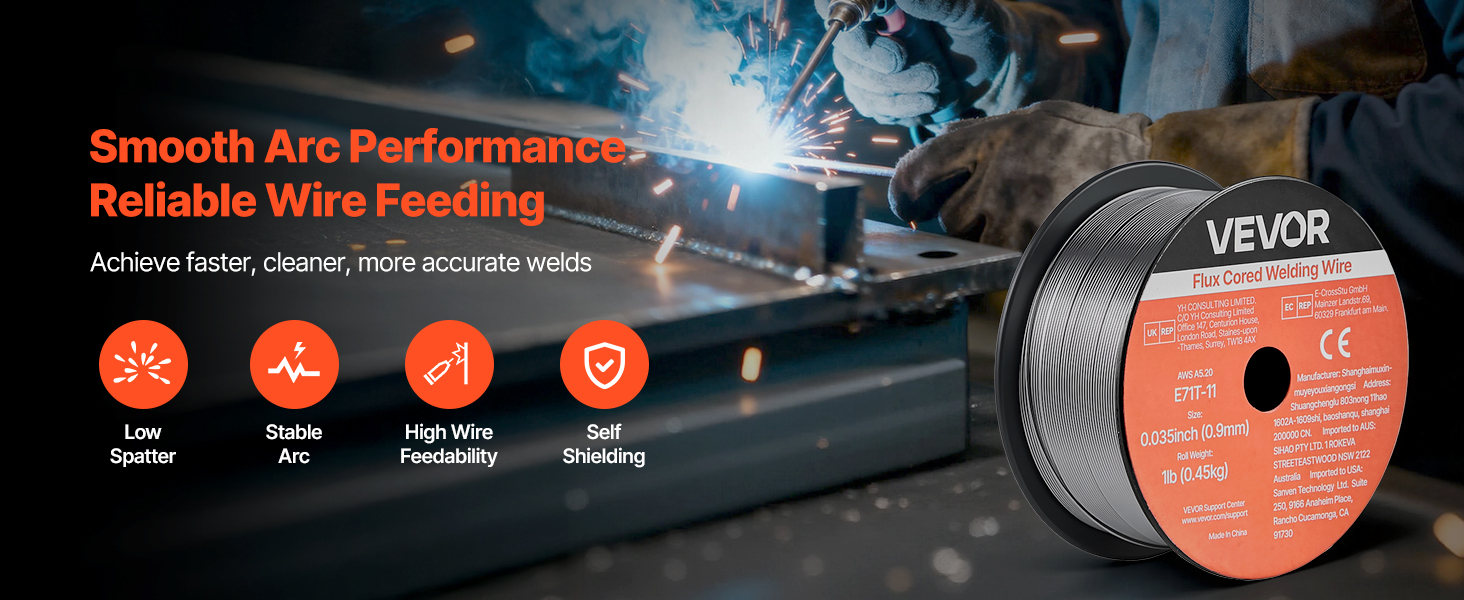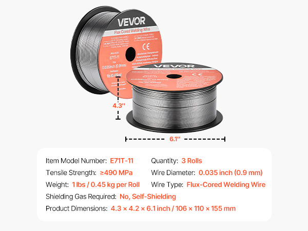 • High Quality & Reliable Welds: The VEVOR 0.035" 1 lbs E71T-11 flux core MIG welding wire delivers stable arc performance with minimal spatter, producing smooth, clean weld beads. Ideal for thin-gauge carbon steel plates and supports multi-pass welding.