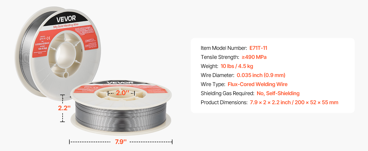 VEVOR 0.035″ 10 lbs E71T-11 flux core welding wire delivers strong, consistent welds with smooth wire feeding and low spatter. Supports all-position gasless welding, multi-pass welding and high tensile strength for reliable performance in automotive, machinery, and DIY welding projects.