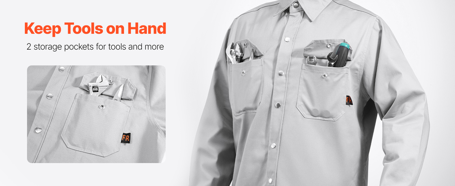 Equipped with 2 pockets, our heat-resistant jacket provides storage space for your essential tools and personal items, ensuring they are safe and easily accessible, keeping you ready for the task at hand.