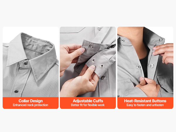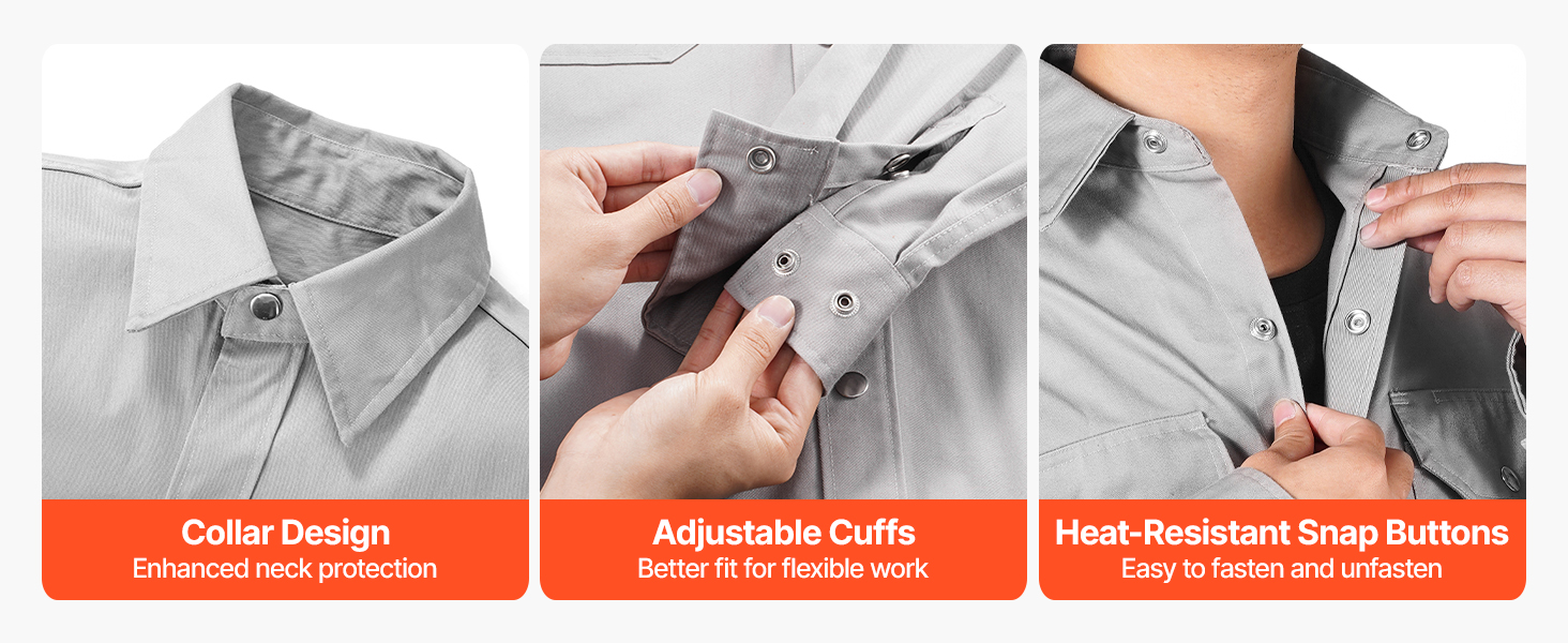 The thoughtfully designed collar provides enhanced neck protection for added safety. Adjustable cuffs offer a better fit, allowing for greater flexibility during work. With sturdy metal snap buttons, the welding safety jacket is easy to put on and take off.