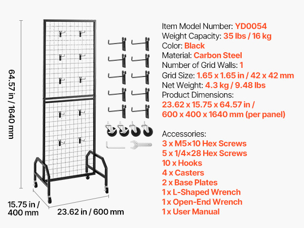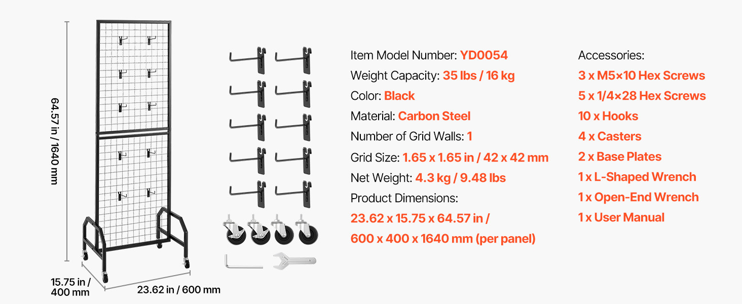 - Heavy-Duty Construction: Built with heavy-gauge steel, reinforced frame, and trapezoidal base; the grid wall panel supports up to 35 lbs / 16 kg.
