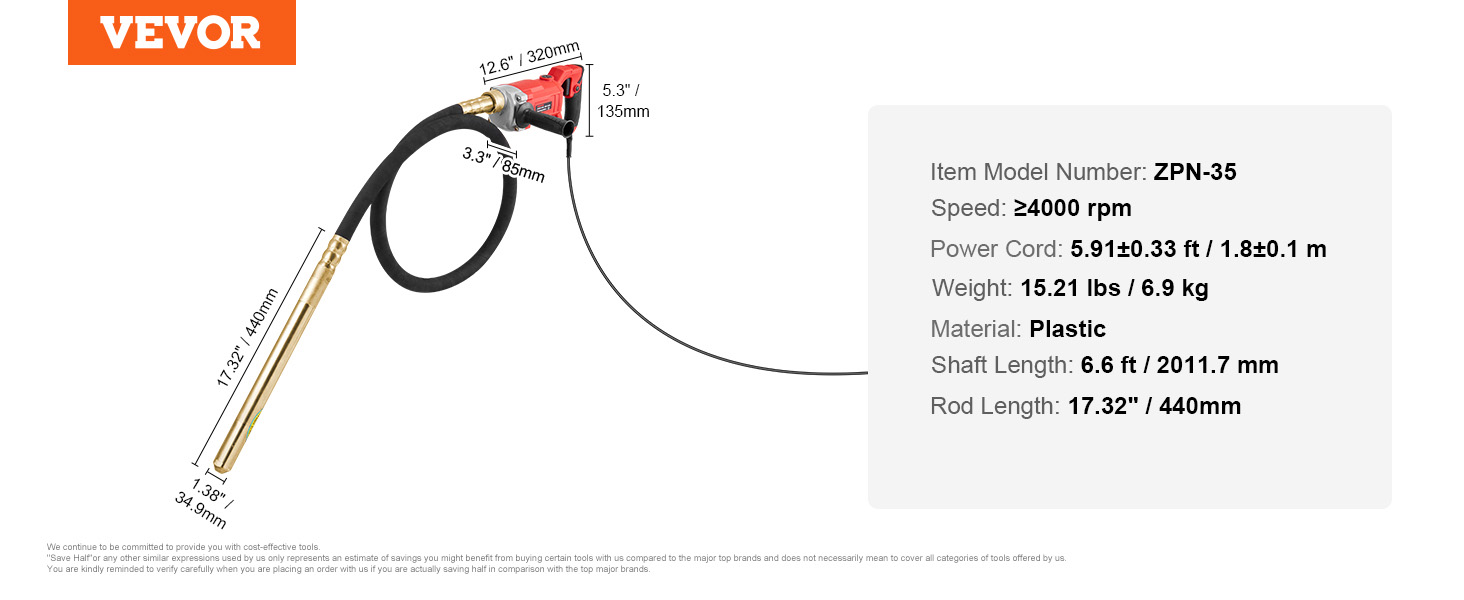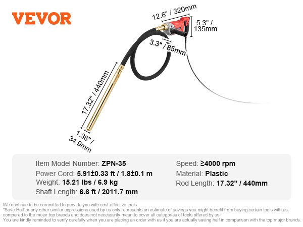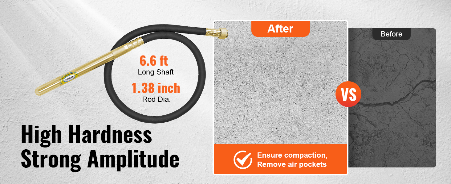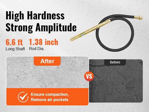 - Enhanced Vibrational Transfer: Vibrating Head Length: 1.81 inch. Head Diameter: 1.4 inch. With its quiet and long 6.6 ft shaft, along with a 5.91 ft power cord, the concrete vibrating tool can be easily used on various construction sites, even if you are far from a power outlet.