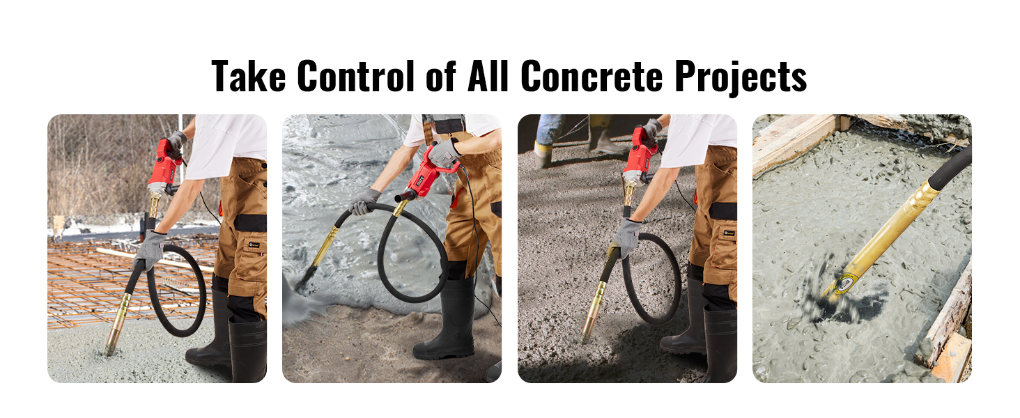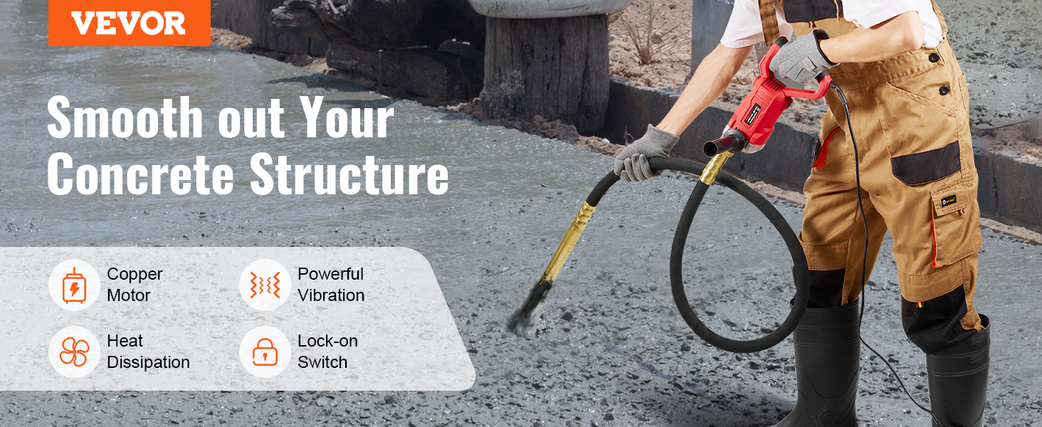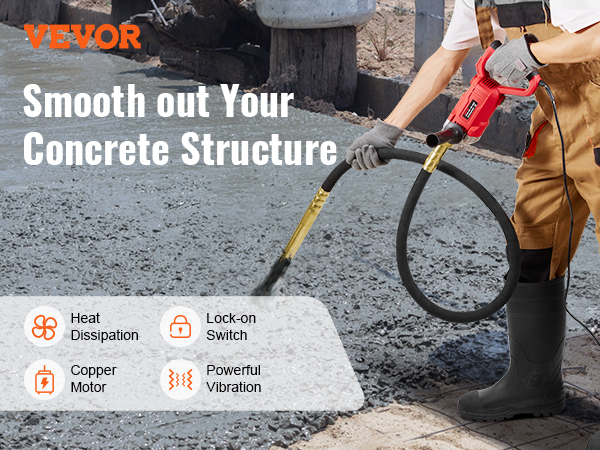 Equipped with a 800W copper motor, it delivers a vibration frequency of 13,000 vibrations per minute and effectively transmits vibrations through the concrete, ensuring uniform distribution and tight compaction.