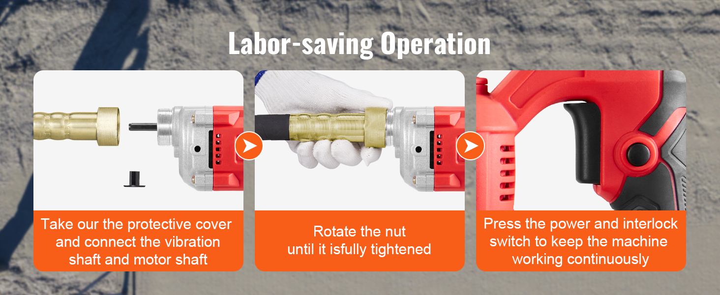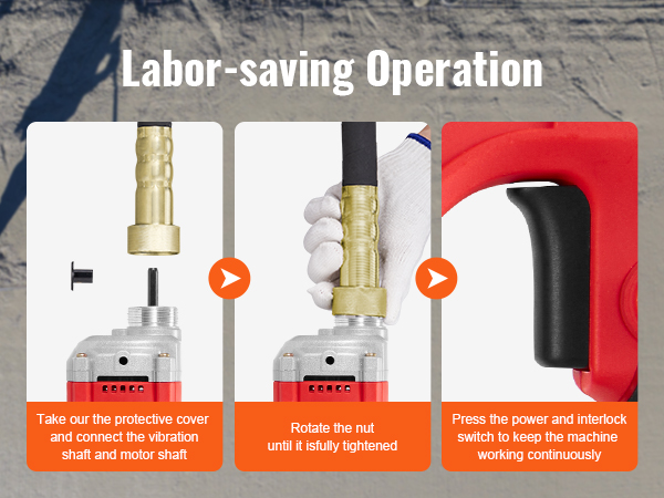 - Effortless Operation: Our handheld concrete vibrating tool is designed to be lightweight and easily transportable. The threaded interface simplifies the attachment process, allowing for quick and effortless connection of the vibrating head or shaft to the concrete vibrator. With its secure and reliable threaded design, all you need to do is tighten it, and you're ready to go!