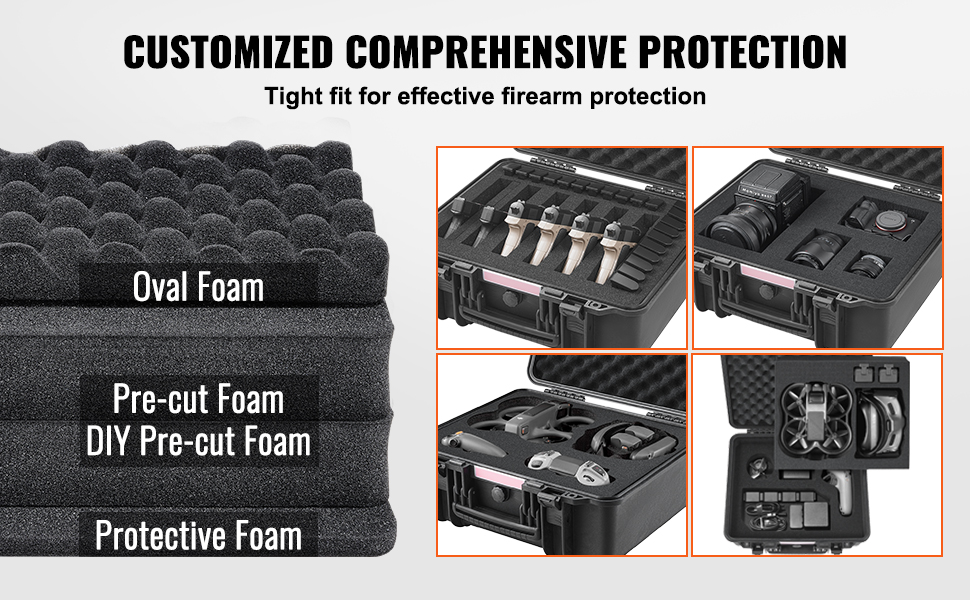 The upper cover of the hard gun case is lined with egg-shaped foam, with pre-cut foam for firearm placement, and the bottom layer includes protective foam to ensure a perfect fit with firearms and prevent damage and scratches due to improper sizing.