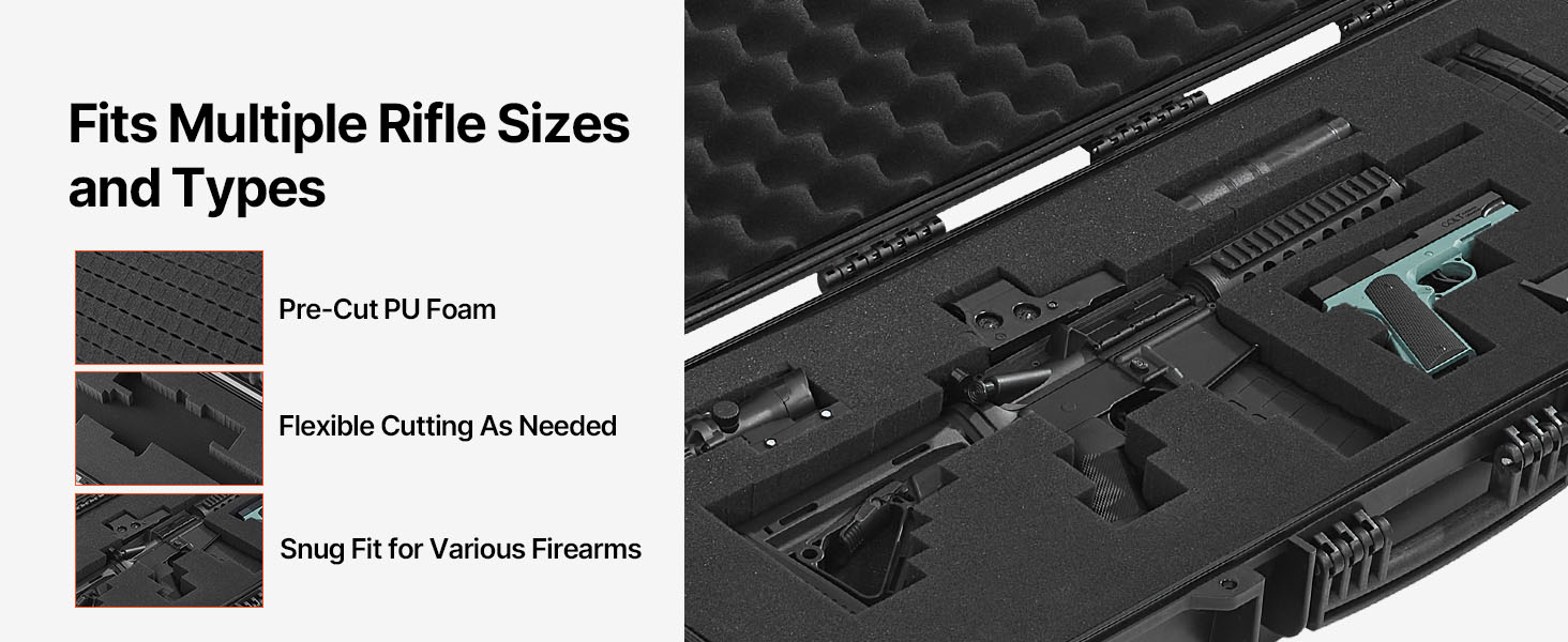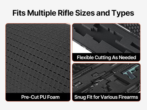 - 4-Layer Foam: Our gun case features 4 layers of soft foam: 1 layer of egg-crate foam for shock absorption; 2 layers of pre-cut foam for a snug fit; 1 layer of solid foam for extra support. You can customize compartments tailored to the shapes of your rifle