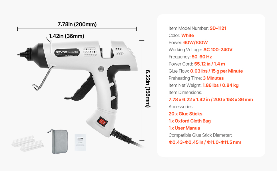 | Compatible Glue Stick Diameter | Ф0.43-Ф0.45 in / Ф11.0-Ф11.5 mm |