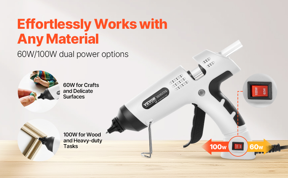 Our hot glue gun kit has dual power options. 60W is ideal for intricate, small projects, while 100W provides the power needed for wood and other heavy-duty materials. This glue gun adapts to your materials for great results every time.