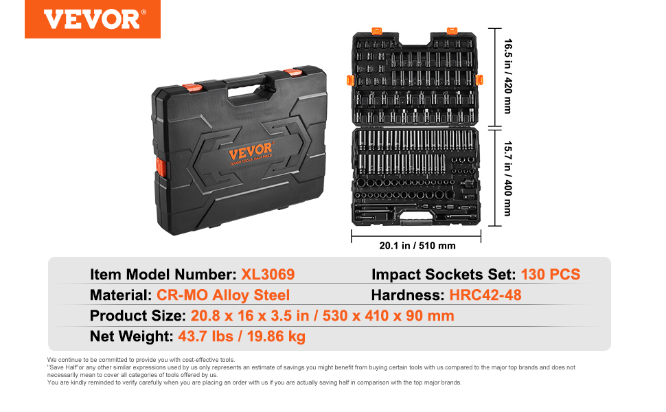 Are you looking for a professional and portable set of impact sockets? VEVOR’s 130-piece impact socket set offers a complete range of tools, especially suitable for repairing different brands of automobiles.