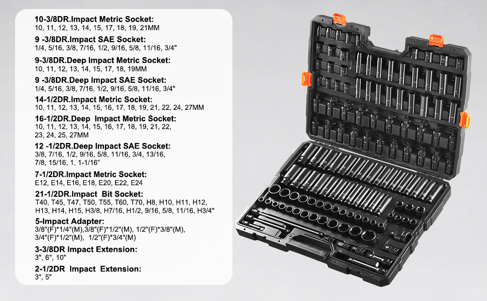 - Convenient Storage & Transportation: The impact socket set includes a heavy-duty toolbox, enabling easy portability. The toolbox allows for organized storage of tools after use, minimizing the risk of scattering or loss.