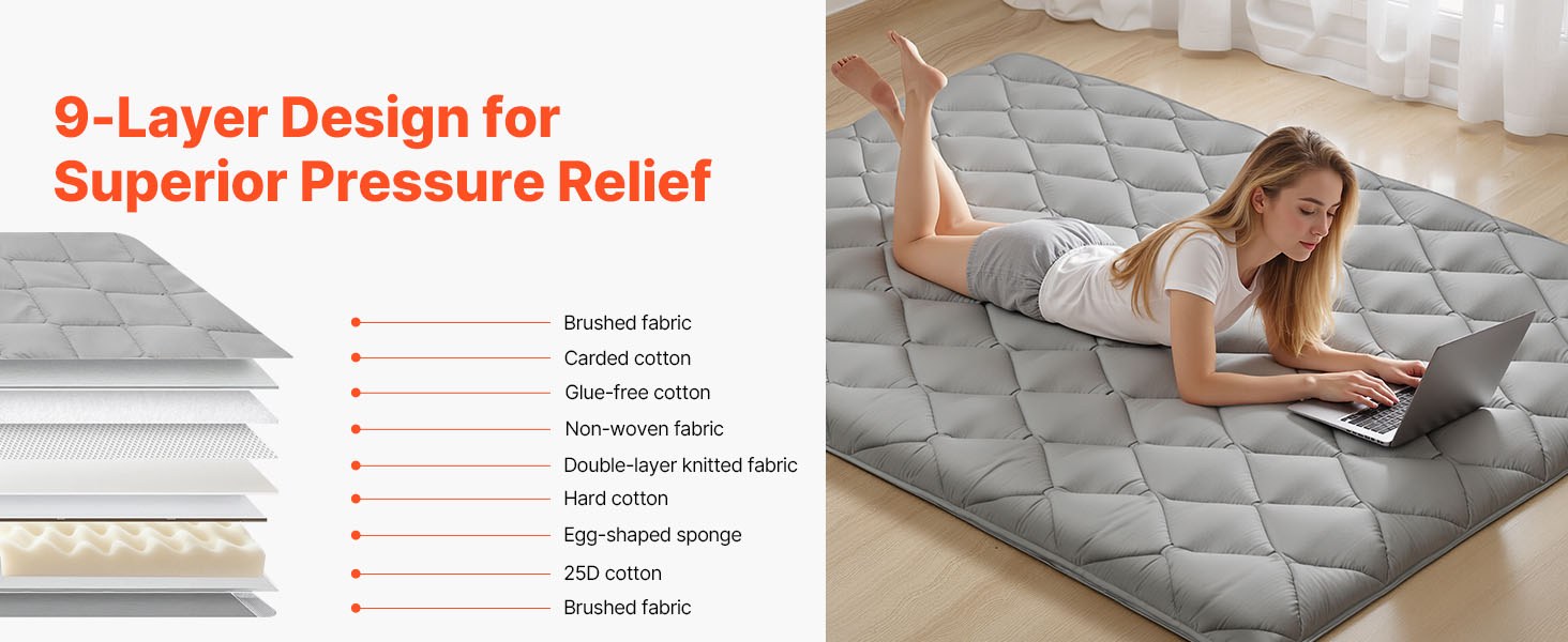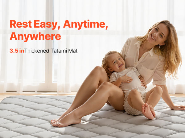 - Thickened 9-Layer Support: This 3.5 in tatami mat features a 9-layer structure with egg-crate foam and 25D memory foam for balanced support and comfort. Its ergonomic design contours to your body and helps protect your spine for a better night's sleep.