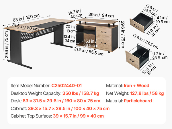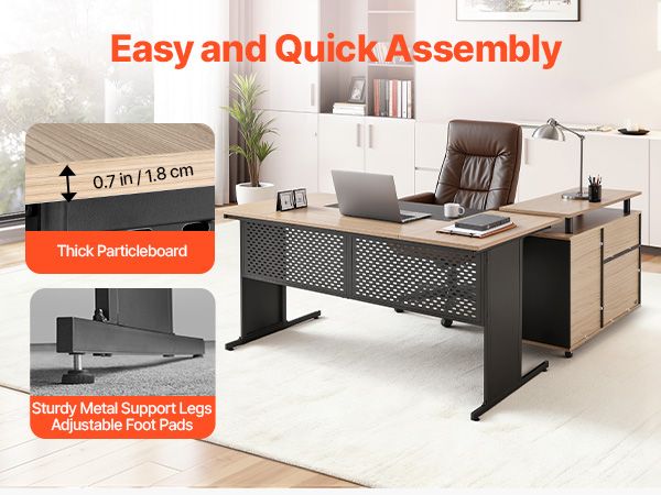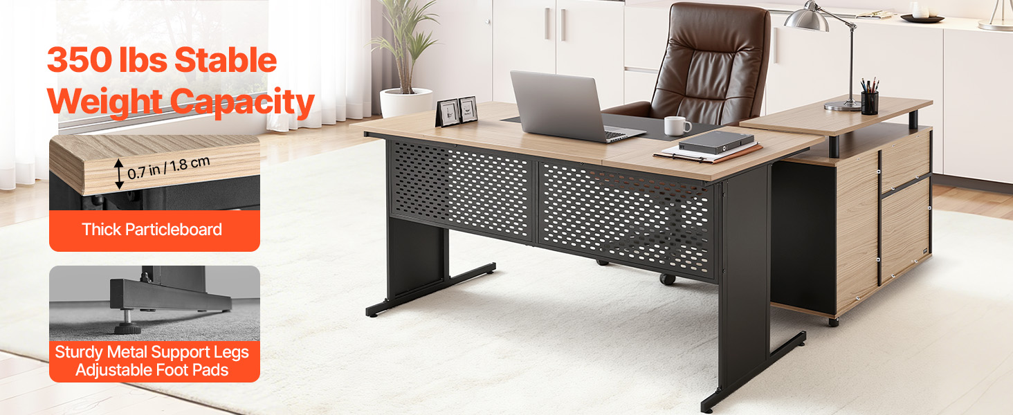 - Durable Build: Our executive L desk features a 0.7 in (1.8 cm) thick particleboard desktop, reinforced metal legs, and adjustable foot pads. It offers scratch resistance and supports up to 350 lbs for long-lasting stability with all your office supplies.