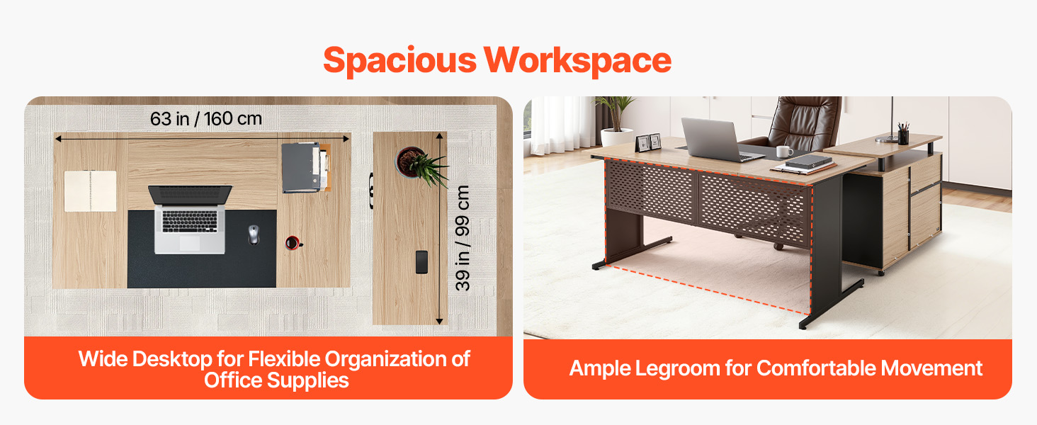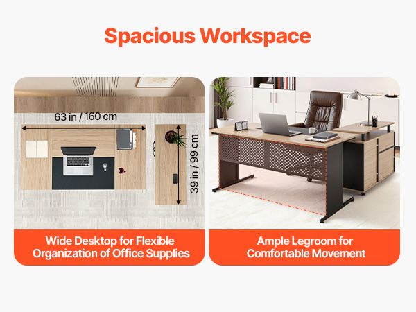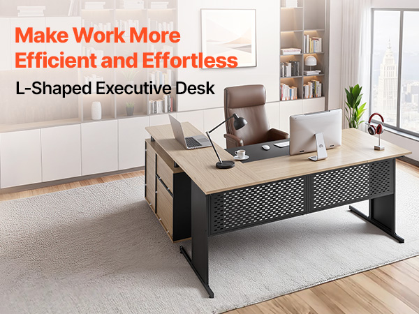 - Spacious Work Surface: Our L-shaped executive desk features an enlarged L-shaped desktop, offering ample space for files, books, and decor while leaving room for your coffee and computer. Generous legroom allows you to stretch easily for optimal work comfort.