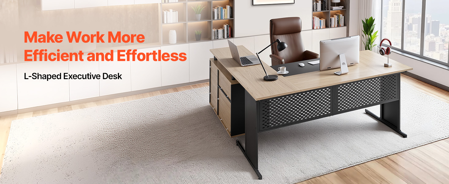 The executive L desk combines a thick wood tabletop with a solid particleboard base. It easily holds computers, printers, and other office equipment, ensuring lasting stability while avoiding wobbling even with extended use.