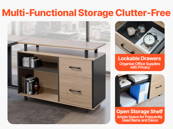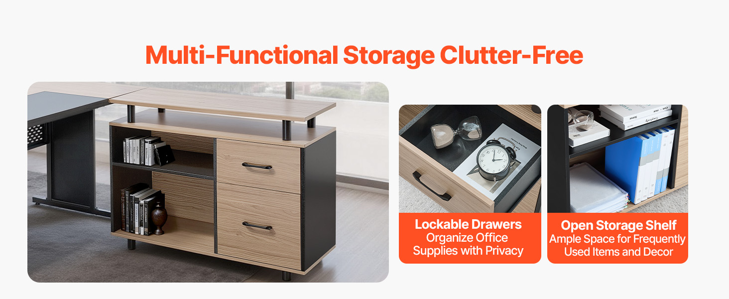- Ample Storage: This large L-shaped desk features lockable drawers for organized office supplies, while open cabinets provide easy access to larger items. This versatile storage design makes it an ideal choice for home office settings.