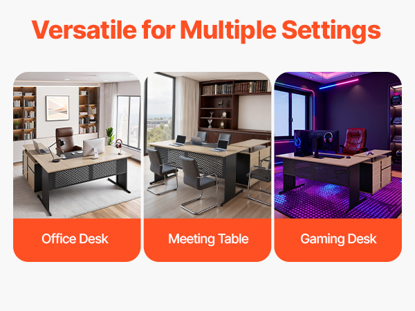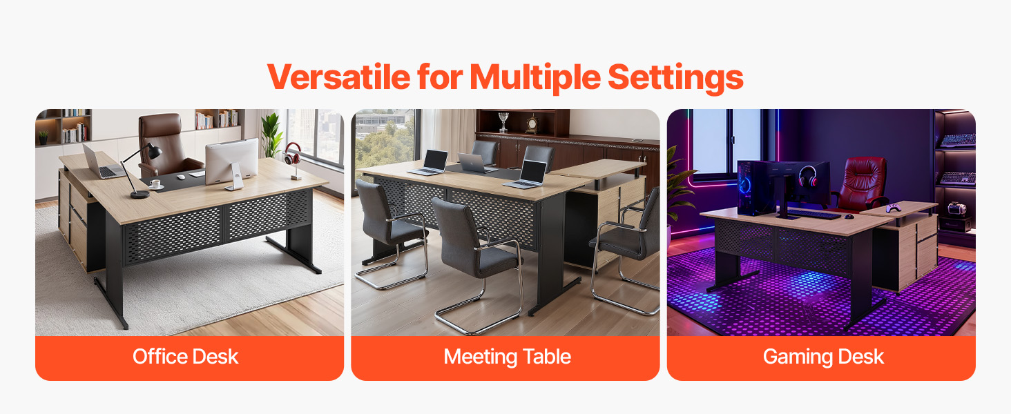 This large L shape desk serves as a computer desk, office desk, conference table, gaming desk, or dining table. Its simple, adaptable design blends various decor styles, making it ideal for home and office use.