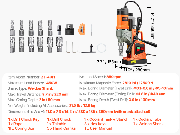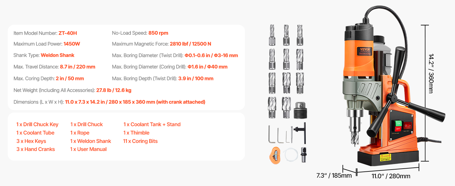 - Understand the Power: 2810 lbf / 12500N of robust force is generated by the electromagnetic thickened base, featuring pure iron anchors. The mag drill press operates stably at any angle during the drilling process. It comes with 11 pcs coring bits for your different drilling needs.