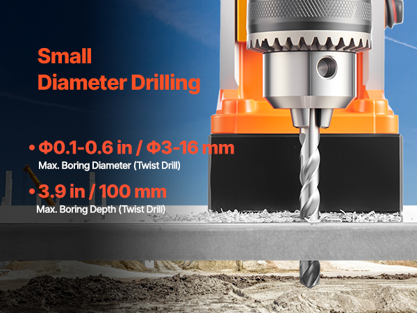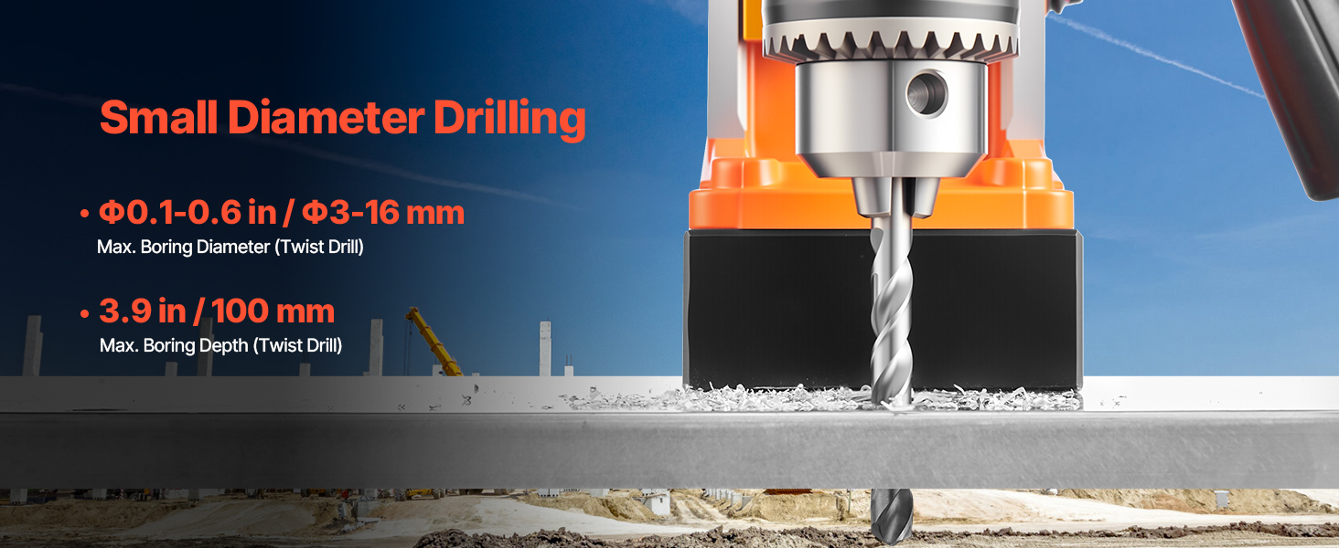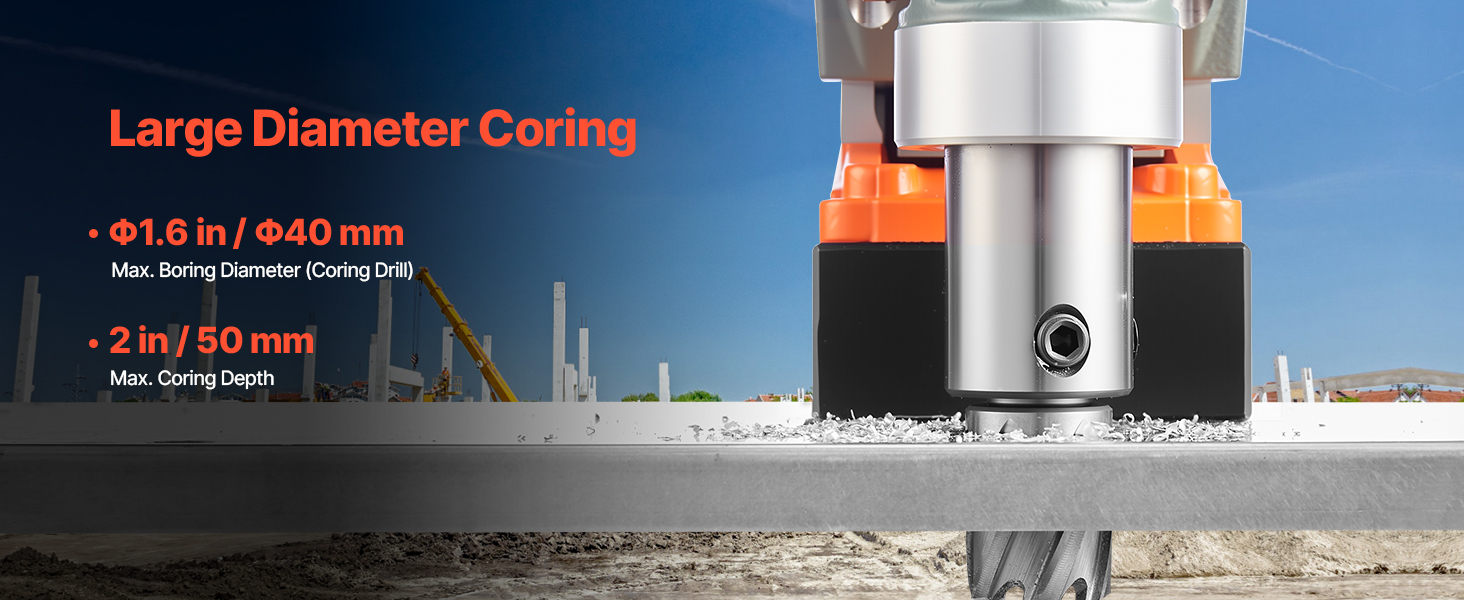 - Top-level Magnet: Get ready for unstoppable power! Our electric mag drill generates exceptionally powerful driving force with its 1450W copper motor. It is capable of drilling into the toughest material at 850 RPM. Max. Boring Diameter (Coring Drill): Φ1.6 in / Φ40 mm; Max. Coring Depth: 2 in / 50 mm