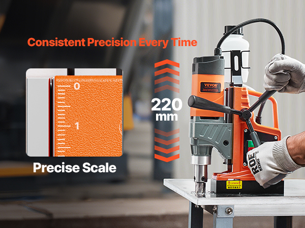 - User-friendly design: A scale has been added to the machine’s frame to help users pinpoint the distance between the drill bit and the drilled material in millimeters. Even a novice can bore accurate and neat holes. In addition, the ergonomically designed handle and 3 extended cranks provide a comfortable grip during handling and moving, saving great effort.