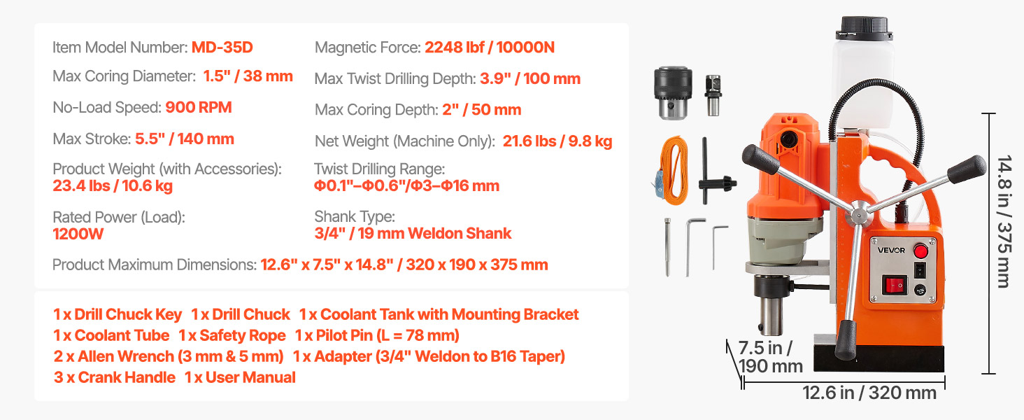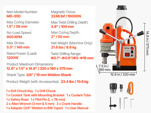 - Powerful Drilling Performance: 1200W motor delivers efficient drilling. The magnetic drill press supports coring diameter up to 1.5" / 38 mm and twisting drilling range from Φ0.1"–0.6" / Φ3–16 mm—ideal for both fine work and large-scale jobs.