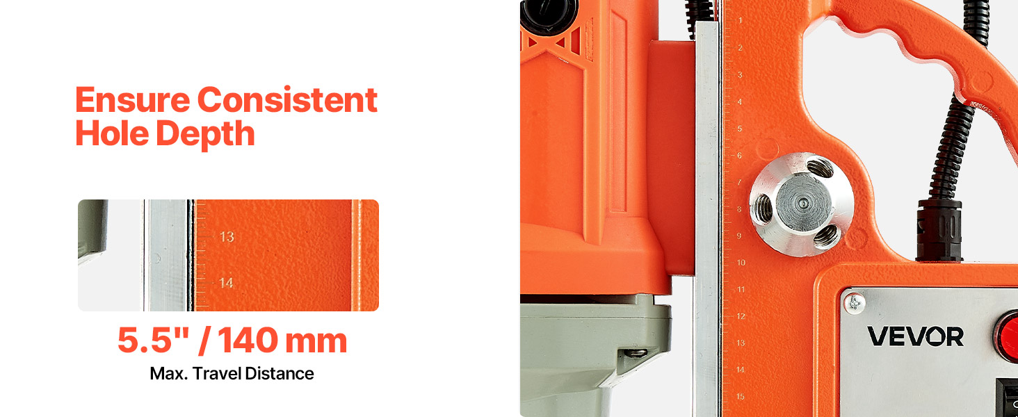 - Precise Control: Equipped with precise scales, depth control is at your fingertips, allowing for easy adjustments and accurate positioning. Paired with a high-precision spindle design, the magnet drill ensures every drilling is accurate.